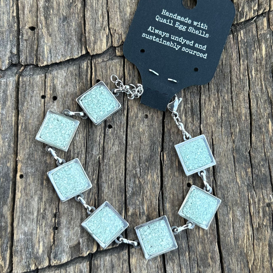 A modern twist on a timeless design. This silver-tone bracelet features five handcrafted squares filled with our signature Celadon quail eggshell—naturally blue, softly speckled, and never dyed. Sleek and structured, it adds a quiet pop of color to any look.